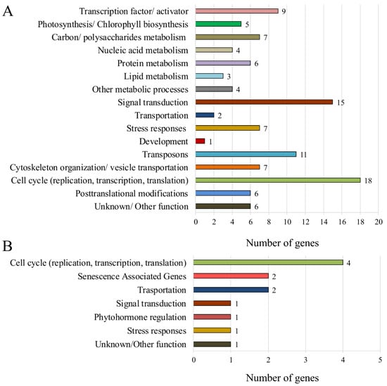 Only 12 genes were specifically downregulated in the 21.3I primary leaves, compared to the WT, two of these under control and senescence conditions, and the ten others, only under the senescence condition. Most of these genes have unique functions. As shown in Figure 5B, four genes were assigned for the functions in the cell cycle (replication, transcription, translation), two for transportation and two as senescence associated genes. The single genes were assigned for functions in the signal transduction, phytohormone regulation, stress response and one has an unknown function.