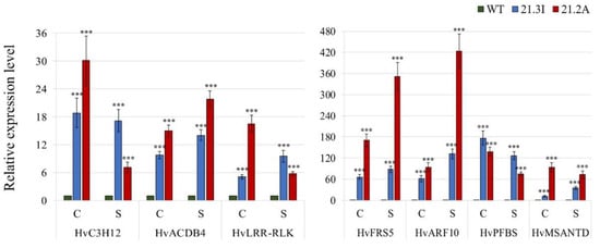 The relative transcript level of the selected genes, as derived from the RNA Seq analysis: HvC3H12, HvACBD4, HvLRR-RLK, HvFRS5, HvARF10, HvPFBS and HvMSANTD, in the control (C) and senescing (S) samples, compared with the corresponding WT-C or WT-S samples (set as 1). Mean relative expression level of at least three independent biological replicates, standard errors and p-values were determined by REST-384 © 2006 (Relative Expression Software Tool-384, version 2.0, [14], Qiagen GmbH, Hilden, Germany) and normalized against HvPP2A, HvActin and HvGCN5. Statistically significant differences between the control samples of OE lines, compared to the WT control leaves and the senescing samples of the OE lines, compared to the WT senescing leaves are indicated by asterisks, p < 0.001 (***).