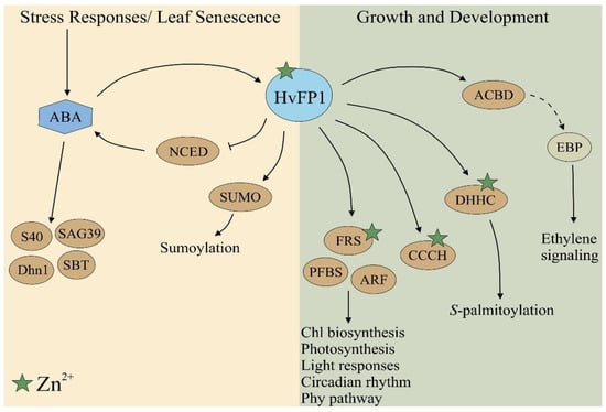 Proposed model for the mode of action of HvFP1 in stress, senescence and growth regulating pathways. Interaction with other proteins (shown as ellipses) and ABA (shown as hexagon) is pictured by arrows (for the positive effect) and bars (for the negative effects). Proteins containing zinc are marked with a green star.
