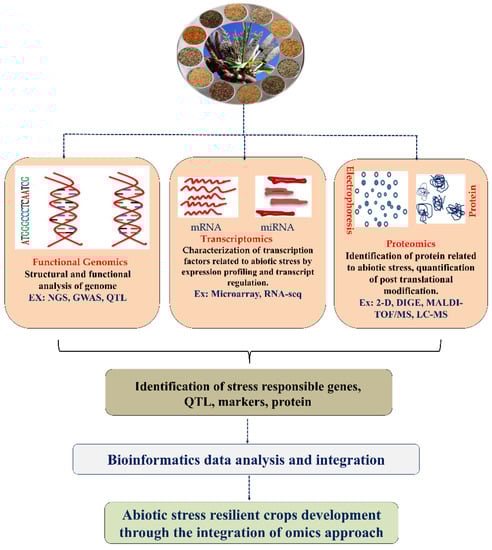 The genomics strategies help develop climate-resilient crop varieties to ensure food security by helping conserve genomic resources. The discovery of genomic variations and genes related to climate adaptation found in wild relatives of crop plants through whole-genome sequencing is an indicator of the development of environmentally-adapted crops [75,76]. Genomics and systems biology approaches toward the discovery of stress-tolerant traits have been made possible by the availability of molecular markers, QTL mapping, genetic mapping, and comparative genomics, the complex relationship of plants and environmental factors, and expression quantitative trait loci (eQTL). These techniques can provide a practical approach to identifying candidate genes involved in abiotic stress tolerance.