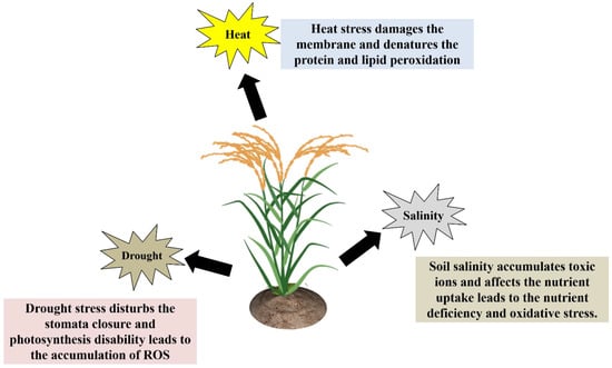 The plant is a sessile organism that serves as the foundation for all living organisms on Earth and as a valuable resource for humans. All cereal crop species are members of the grass (Poaceae or Gramineae) family, the fourth largest family of flowering plants [1]. The major cereal crops, rice, maize, sorghum, finger millet, foxtail millet, wheat, barley, and other cereal crops, are the world’s primary food sources [2]. Food is necessary to provide energy for body growth, function, and defense. Our body’s basic requirements include proteins, minerals, carbohydrates, fiber, vitamins, and lipids, all essential nutrients. Among these requirements, carbohydrates, proteins, and fats which are needed in large quantities are called “macronutrients,” and the requirements of minerals and vitamins needed in small amounts are called “micronutrients” [3]. Cereals such as rice are enriched with carbohydrates; wheat is rich in carbohydrates and certain vitamins (B6); maize is rich in vitamins and micro elements, viz., P, Mg, Mn, Ca, Zn, Cu and Fe (depending on the varieties); millets are rich in fiber and proteins (https://data.nal.usda.gov/ (accessed on 16 October 2022)). These cereals are essential for the routine life of humans, and their production should be increased owing to the increasing population. However, abiotic stress is a global problem, limiting global crop production and reducing the yields of the plants by more than 50% in quality [4]. Abiotic stress conditions such as drought, high temperatures, salinity, mineral deficiency, and metal toxicity are usually experienced by plants in both natural and agricultural systems [5,6,7]. Among these stress factors, drought (low water availability), heat (extreme temperature), and salinity (high salt content) are the most important stresses, having a huge effect on the growth and productivity of the crops [8,9,10].