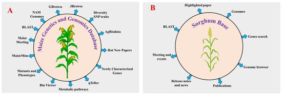 Graphical illustration of the maize genetics and genomics database (MaizeGDB) and sorghum base. Various tools have been implemented in the MaizeGDB (A) (https://www.maizegdb.org (accessed on 10 October 2022)) and sorghum base (B) (https://www.sorghumbase.org (accessed on 18 October 2022)), both of which help to collect all molecular data from the database.