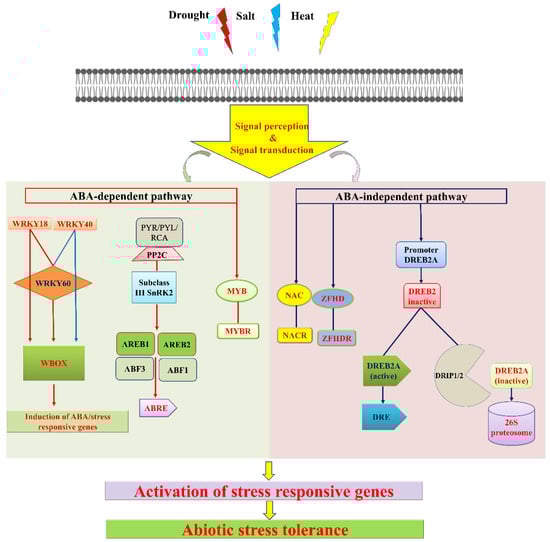 Schematic representation describes the ABA-dependent and independent signaling pathways involved in acquiring drought, salt and heat stress responses, and tolerance. ABA—abscisic acid; ABRE-ABA-responsive element; AREB-ABRE-binding protein; ABFs-ABRE-binding factors; DREB2-DRE-/CRT-binding protein 2; DRE-dehydration-responsive element; SnRK2-SNF1-related kinase 2; DRIP1-DREB2A-interacting protein 1; MYB-MYB proto-oncogene transcription factor; NAC—no apical meristem transcription factor; PP2C—protein phosphatases 2C; PYR—pyrabactin resistance 1; PYL—pyr1-like; RCA—regulatory components of ABA receptor; ZFHDR—zinc finger homeodomain transcription factor.