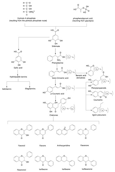 Phenolic compounds belong to a large compound class that includes both simple and complex structures with at least one aromatic ring. We can highlight several derived classes of phenolic compounds and their basic skeleton: C6 simple phenols, benzoquinones; C6-C1 phenolic acids; C6-C2 acetophenones and phenylacetic acids; C6-C3 phenylpropanoids; C6-C3 coumarins; C6-C4 naphthoquinones; C6-C1-C6 xanthones; C6-C2-C6 stilbenes and anthraquinones; C6-C3-C6 flavonoids and isoflavonoids; (C6-C3)2 lignans; (C6-C3-C6)2 diflavonoids; (C6)n plant melanins; (C6-C3)n lignins; (C6-C1)n atemoya tannins; (C6-C3-C6)n condensed tannins. Figure 7 shows the simplified biosynthetic route of phenolic compounds, highlighting flavonoids.