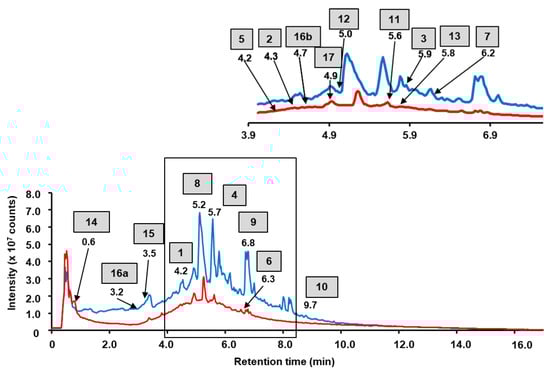 Total ion current chromatograms (TICs) obtained for aqueous (red line) and ethyl acetate (blue line) fractions of the total aq. ethanolic extract of water avens. The analysis relied on the RP-UHPLC-QqTOF-MS, accomplished with a Waters ACQUITY I-Class UPLC System coupled online to a Sciex TripleTOF 6600 mass spectrometer. The assignments could be confirmed by SWATH-MS/MS data (Supplementary information, Figure S3) and targeted MS/MS (Table 1, Figure S4).
