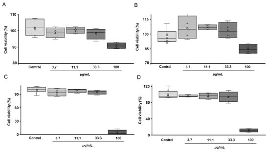 Results of the MTT assay (n = 4) addressing cytotoxicity of the aqueous (A,B) and ethyl acetate (C,D) fractions of the total G. rivale L. aqueous ethanolic extract, and performed 24 (A,C) and 48 (B,D) hours after supplementation of the plant isolates to the cell culture. The data are represented as median, interquartile range, minimal and maximal values.