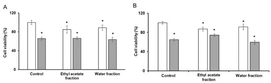 Results of the MTT cell viability test accomplished with SH-SY5Y cells with aqueous and ethyl acetate fractions of the total ethanolic extract of G. rivale L. Cells were treated for 24 h (A) and 48 h (B) in the absence (control) and presence of the G. rivale L. fractions of total extract with (grey) and without (white) supplementation of 25 µmol/L Aβ25–35. The assay was performed in quadruplicates. Mann–Whitney test and Bonferroni correction for multiple comparison were applied to address statistically significant differences observed in treated cells: *—p ≤ 0.05 vs. untreated with Aβ25–35 negative control. The controls were supplemented with fresh medium without addition of the fractions of total extract.