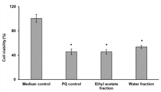 To assess the viability, SH-SY5Y cell culture was seeded in the wells of 96-well microtiter culture plates at the density of 5 × 104 cells per well. To determine the neuroprotective effect of fractions of total extract, SH-SY5Y cells were incubated with paraquat in the presence or in the absence of the potentially protective isolates for 24 h.