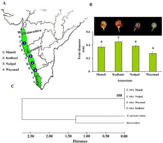 Fruit samples collected across all the accessions (Figure 1A) were evaluated for their size and texture. Interestingly, fruits from Kodkani, Karnataka, and Wayanad, Kerala, are significantly larger and smaller than those from other accessions, respectively (Figure 1B). The fruit size of the Kodkani accession is significantly more than the other accessions (one way ANOVA, F4,18 = 12.91; p = 0.0002). Moreover, the fruits from Kodkani were spherical, whereas fruits from other locations were obovate. On the other hand, Wayanad fruits are the least wrinkled among other accessions (Figure 1B inset). Dissimilarities in Embelia fruit morphology necessitate the molecular identification of the collected samples. Chloroplast maturase K gene (matK) is one of the most variable coding genes of angiosperms and is used for the identification of plant species. Molecular identification by matK amplification is often used for the accurate genetic identification of an organism. Therefore, all the samples were evaluated by comparing the sequence homology of the matK gene with the reported sequence of E. ribes in the NCBI database (Table S1). The maximum percent identity and query cover threshold was more than 98% and 85%, respectively. Further, a phylogenetic tree was constructed with the matK sequences from all the Embelia accessions, E. tsjeriam-cottam (Roem. & Schult.) A. DC. and Maesa indica (Roxb.) A. DC. sequences (Figure 1C); E. tsjeriam-cottam and M. indica were used as outgroup. Embelia accessions collected across the Western Ghats did not show any genetic distances, whereas the outgroups showed a significant genetic distance from the Embelia accessions (Figure 1C). Our results confirmed the identity of the collected fruits as E. ribes.