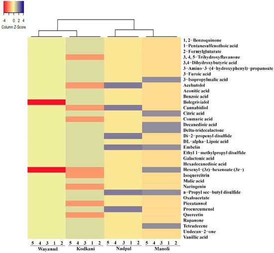 We look further to find the compound similarities across the accessions by creating the Venn diagram (Figure 3C, Table 1). We found that only two compounds, embelin and n-propyl sec-butyl disulfide, are present in all the accessions. The number of unique compounds present in Manoli (hexenyl-(3z)-hexenoate (3z-)) and Wayanad (bolegrivialol) accessions is one; however, Kodkani accession possesses six unique compounds (Figure 3C, Table 1) that belong to the phytophenols, namely 3,4,5-Trihydroxyflavanone, Dihydro 3-coumaric acid, quercetin, isoquercitrin, naringenin, and piceatannol (Table 1). On the contrary, Nadpal accession did not show the occurrence of any unique compounds. Moreover, through the pairwise analysis of similarity percentage (SIMPER test; Bray-Curtis dissimilarity index) in the compounds at a 50% cut-off, we identified 15 compounds responsible for the grouping accessions (Table S3).