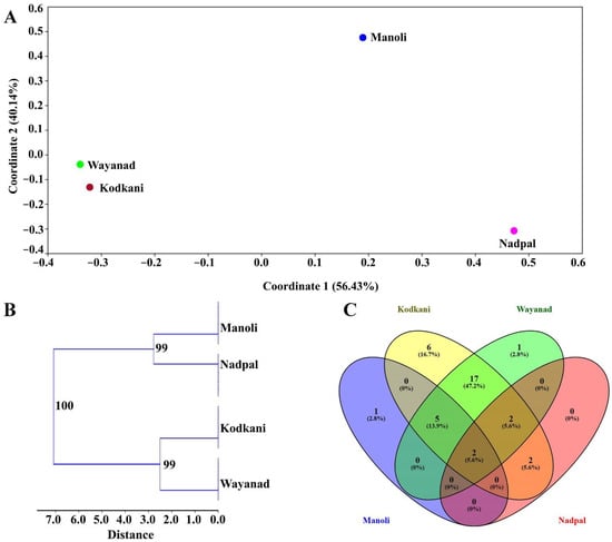 The multivariate analysis of metabolomics data. (A) The plot of principle coordinate analysis (PCoA) with identified metabolites across the accessions using the Jaccard coefficient and transformation exponent value 2. The percentage of the variation is captured in Coordinates 1 and 2. The values in parentheses show the percentages of the variation. The x- and y-axes are indicated by the eigenvalue scale. (B) A phylogenetic tree with the single linkage algorithm and Jaccard similarity index at the 1000 bootstrapping threshold. The tree shows the clusters among the accessions based on the similarities in the metabolites in each of the five samples of a given accession. Bootstrap values of the respective clusters are depicted at each tree node. (C) The Venn diagram depicted the number of compounds shared and uniquely present along with all the combinations. Kodkani and Wayanad accessions show the maximum number of shared compounds, whereas Manoli and Nadpal accessions show the least number of shared compounds. Similarly, Kodkani accession showed a maximum (six) number of uniquely present compounds. However, Nadpal accession does not have any unique one.