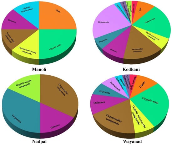 Distribution of chemical classes across the accessions. Identified compounds were grouped according to their compound classes. A total of 11 classes of compounds were found. Kodkani accession showed all 11 groups, followed by ten groups in Wayand, six in Manoli, and four in Nadpal.