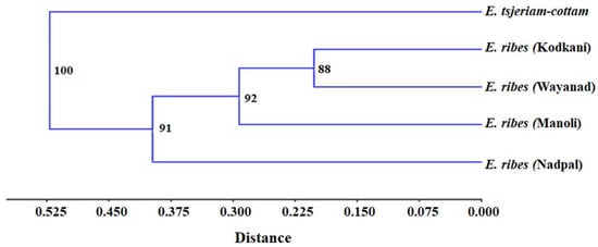 Differences in fruit phenotype hinted towards the genetic diversity of Embelia across the accessions. Moreover, genetic variability is one of the prime factors that tunes plants’ metabolic profiles. Therefore, to check if the genotypic diversity orchestrates the metabolic variations across the Embelia accessions, we examined the genotypic diversity of Embelia accessions with inter simple sequence repeat (ISSR) markers. As demonstrated in a previous study, we used nine ISSR markers (Table S5) that are polymorphic for Embelia plants [18]. All the markers yielded robust and reproducible polymorphic amplification patterns. Ninety-four bands were generated, with an average of 10.4 products per primer. Among these, 90 bands (95.74%) were polymorphic and four (4.25%) were monomorphic (Table S6). The number of polymorphic bands ranged from six (in the case of primer 816) to 13 (in the case of primer 857) (Table S6). While the primers 809, 857, and 881, had a high percentage of polymorphic bands (PPB), primer 816 showed the lowest PPB (6.38%) (Table S6). A hierarchical cluster was generated with the binary matrix using an unweighted neighbor-joining method with Jaccard’s coefficient of dissimilarity that clustered the accessions into two main clades, and the clades having Embelia accessions are further formed into three clades (Figure 5). The presence of Wayanad and Kodkani accessions in the same clade suggests that they share the maximum similarity. Interestingly, Manoli accession shares similarities with Wayanad, Kodkani, and Nadpal accessions. E. tsjeriam-cottam was used as an outgroup that showed significant differences with Embelia accessions and clustered separately. In the Embelia cluster, the high percentage of polymorphism suggests high genetic variability among the accessions under study.