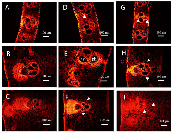 The culm sheath also included epidermal, basic, and vascular tissues. Vascular bundles were arranged in a relatively ordered manner, close to the abaxial side. One side of the paraxial plane was composed of multiple layers of parenchymal cells. Along the transverse plane, the vascular bundles of the sheath alternate in size in single rows, with larger fibrous caps on the distal plane (Figure 4A–F). The vascular bundles of the sheath blades were directly connected to the vascular bundles of the sheath proper, except that the outer fibrous cap was much less developed than that of the sheath proper. The vascular bundles connecting the base of the bamboo sheath to the base of the bamboo internode were observed by acid magenta staining (Figure S3A,B). The transport of water and assimilate between the bamboo sheath and internode depends on vascular bundles. The culm sheaths at the base of the 3-m-long bamboo shoots were shriveled and fractured, and the vascular bundles were distributed in a disorderly way, with more fibrous cells than other parts of the culm sheath of the bamboo shoot (Figure 4B). The results indicated that the culm sheath at the base of the bamboo shoot was senescent. The large and small vascular bundles were arranged at intervals with the phloem facing the outer sheath; the vascular bundles were also concentrated in the outer sheath and arranged relatively neatly, and the inner sheath was nearly full of parenchymal cells. The outer cell wall was thickened to protect the inner tissue (Figure 4C).