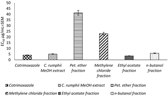 The assay was carried out using virulent RH T. gondii strain, which was obtained from the Medical Parasitology Department, Faculty of Medicine, Alexandria University, Egypt. Different concentrations of the total methanol extract of the C. rumphii leaves and its different fractions were tested for toxplasmocidal activity according to the method reported by [31]. The mean effective concentration (EC50) in μg/mL was calculated and compared to that of cotrimoxazole as a reference drug.