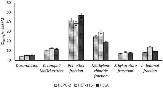 Cytotoxic effect (IC50 ± SEM) of C. rumphii methanol extract and different fractions against different cell lines.