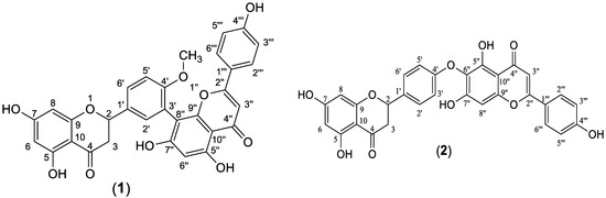 2,3-Dihydro-4′-O-methylamentoflavone (1). Amorphous yellow powder; UV (MeOH) λmax: 230, 294 and 331 nm see (Supplementary Material Figure S4); 1H-NMR (CD3OD, 400 MHz) δ (ppm) 7.50 (m, H-2′, 1H), 7.48 (m, H-6′, 1H), 7.38 (m, H-2′′′, 6′′′, 2H), 7.10 (dd, J = 2.8, 8.8 Hz, H-5′, 1H), 6.68 (m, H-3′′′, 5′′′, 2H), 6.51 (s, H-3″, 1H), 6.24 (s, H-6″, 1H), 5.80 (d, J = 2.4 Hz, H-8, 1H), 5.77 (d, J = 2.4 Hz, H-6, 1H), 5.37 (dd, J = 2.8, 13.2 Hz, H-2, 1H), 3.66 (s, OMe-4′, 3H), 3.07 (m, H-3ax, 1H), 2.68 (m, H-3equ, 1H) see (Supplementary Material Figure S1A); 13C-NMR (CD3OD, 100 MHz) δ (ppm) 196.2 (C-4), 182.8 (C-4″), 167.0 (C-7), 164.5 (C-5), 164.1 (C-2″), 163.4 (C-9), 161.9 (C-5″), 161.3 (C-7″), 160.8 (C-4′′′), 158.1 (C-4′), 154.8 (C-9″), 131.1 (C-2′), 130.7 (C-1′), 127.9 (C-2′′′, 6′′′), 127.8 (C-6′), 121.7 (C-1′′′), 121.1 (C-3′), 115.4 (C-3′′′, 5′′′), 110.7 (C-5′), 104.8 (C-8″), 103.8 (C-10″), 101.9 (C-3″), 101.7 (C-10), 98.3 (C-6″), 95.7 (C-6), 94.8 (C-8), 79.0 (C-2), 54.7 (4′-OCH3), 43.0 (C-3) see (Supplementary Material Figure S1B); HSQC and HMBC NMR (CD3OD) see (Supplementary Material Figure S2); ESIMS: m/z 577.1 for [M+Na]+ and 553.1 for [M-H]− see (Supplementary Material Figure S3).