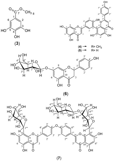 The ethyl acetate fraction was subjected to extensive chromatographic separations to isolate seven compounds (1–7) (Figure 3). Six known compounds were 2,3-dihydro-4′-O-methylamentoflavone (1) [14,15], 2,3-dihydrohinokiflavone (2) [15,16,17], methyl gallate (3) [18,19], amentoflavone 4′-O-methyl ether (4) [15,20,21], amentoflavone (5) [15,22] and naringenin 7-O- β-D glucoside (6) [18,23,24]. Compound (7) was identified as a novel 4′, 4′′′ biapigenin di-C-glucoside. Compounds (1, 3 and 6) were isolated for the first time from C. rumphii. The structures of the compounds (1–6) were identified by various spectroscopic analyses, including (UV, IR, ESIMS, 1H, 13C, DEPTQ, HSQC and HMBC NMR), in addition to the comparison with the available authentic compounds and the literature data [14,15,16,17,18,19,20,21,22,23,24]. The elucidation of compound (7) is discussed in detail below. The IR, UV, mass and NMR spectra of all the isolated compounds are presented in (Supplementary Material Figures S1–S29).