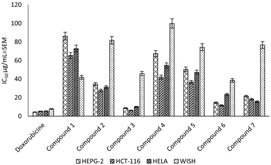 Compounds (1–7) were evaluated for the cytotoxic activity against the HEPG-2, HELA and HCT-116 cell lines. The results showed that compound (3) was the most potent against HEPG-2, HELA and HCT-116, with IC50 values of 8.67 ± 0.6, 10.08 ± 0.9 and 6.24 ± 0.5 μg/mL, respectively, followed by compound (6), which exhibited a strong cytotoxic activity, with IC50 values of 14.49 ± 1.1, 23.32 ± 2.0 and 11.63 ± 0.9 μg/mL, respectively. Finally, compound (7) showed a strong cytotoxic activity, with IC50 values of 21.47 ± 1.8, 15.66 ± 1.3 and 18.17 ± 1.4 μg/mL, respectively (Figure 5). Additionally, the selectivity indices for the ethyl acetate fraction and its constituents against these cancer cell lines (HEPG-2, HELA and HCT-116) were calculated as reported in the literature data [30] (Supplementary Material Table S4). The higher the magnitude of the selectivity index of a test material, the greater its selectivity. In this study, the ethyl acetate fraction and its isolated compound (3) showed higher selectivity for the cancer cells than the normal cells compared to doxorubicin.