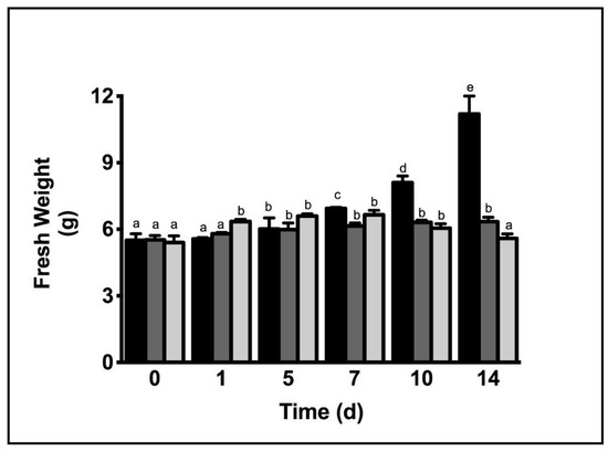 Fresh weight of Caulerpa grown in seawater (Sw—black bars), seawater + ZnSO4 5 mg L−1 (ZnL—dark grey bars) and seawater + ZnSO4 10 mg L−1 (ZnH—light grey bars) for 14 days. Letters indicate significant differences between treatments and days (p ≤ 0.05). Letters indicate ANOVA significance between treatments.