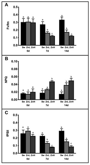 Fv/Fm (A), NPQ (B) and fPSII (C) of Caulerpa grown in seawater (Sw—black bars), seawater + ZnSO4 5 mg L−1 (ZnL—light grey bars) and seawater + ZnSO4 10 mg L−1 (ZnH—dark grey bars) for 14 days. Letters indicate ANOVA significance between treatments.