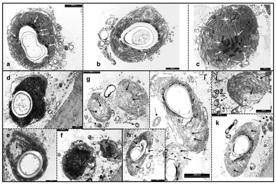 TEM micrographs of chloroplasts from C. racemosa samples exposed to Sw (seawater) (a–c); ZnL (ZnSO4 5 mg L−1) (d–f); and ZnH (ZnSO4 10 mg L−1) (g–k). Description: (a) and (b) typical Caulerpa chloroplasts, with a central starch granule and well-organized thylakoids; white arrows indicate plastoglobuli; (c) Caulerpa chloroplast with many plastoglobules (white arrows); in this section, the starch granule is not present (or not visible); (d) Caulerpa chloroplast exposed to ZnL conditions; the organelle appears healthy but no plastoglobulus is visible; (e) Caulerpa chloroplast exposed to ZnL conditions, in which the severe disorganization of thylakoids is evident (black arrow); (f) two chloroplasts from ZnL-exposed Caulerpa; base membrane disorganization is indicated by black arrows; (g) ZnH-exposed Caulerpa chloroplasts; the strong disorganization of the thylakoids is indicated by black arrows, and rare plastoglobuli are visible (white arrows); (i) this ZnL chloroplast shows a central starch granule, but the thylakoid system appears disorganized (black arrows), even more plastoglobuli are visible (white arrows) and a peroxisome with lipid drops inside is indicated (dotted arrow); (j) another ZnH chloroplast with unstacked membranes (black arrows) and rare plastoglobuli (white arrows); some unhealthy mitochondria are nearby visible (dashed arrows); (k) a ZnH-exposed chloroplast similar to that in (i); note several microbodies (possibly peroxisomes) with lipid drops inside (dotted arrows). Scale bars: (a,j,k) 2000 nm; (b–h)1000 nm; (e) 500 nm.