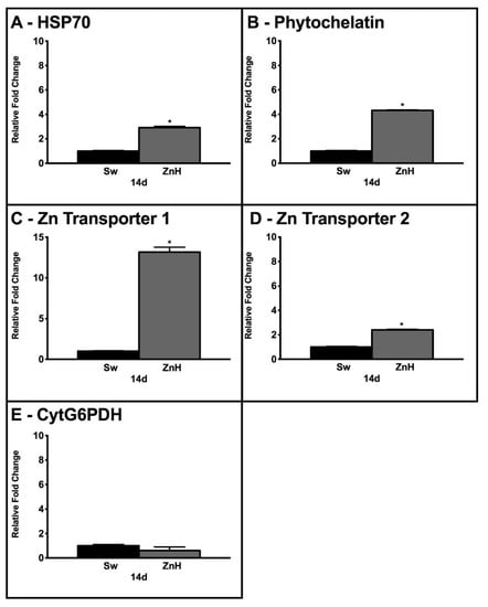 Gene expression levels of HSP70 (A), phytochelatin (B), Zn transporter 1 (C), Zn transporter 2 (D) and cytG6PDH (E) after 14 days in Sw (black bars) and ZnH (grey bars) conditions, measured by qRT-PCR. Variations are indicated as relative fold change in ZnH with respect to respective controls (Sw). mRNA levels were calculated relative to the expression of the RNA GAPDH, used as a calibrator. Asterisks indicate significantly different values at p ≤ 0.05 (*).