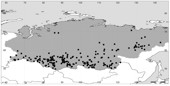 Four out of six Axyris species—namely A. amaranthoides, A. hybrida, A. prostrata, and A. sphaerosperma—are native to Siberia [3]. According to the latest examination of the genus in Siberia [16], A. amaranthoides is widespread in Southern Siberia, with a few records in Northern and Eastern Siberia; A. hybrida mostly occurs in Southern Siberia with scattered findings in Eastern Siberia; and A. prostrata is present in Southern Siberia. No distribution map of Axyris sphaerosperma was provided by M. Lomonosova [16], but several findings in Altai and Tyva Republics were reported, as was one finding in the city of Yakutsk (Sakha Republic).