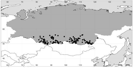The taxonomic revision of the herbarium material was conducted at ABGI, G, LE, LECB, MHA, MSK, MSKU, MW, MWG, MOSP, NS, NSK, PE, PVB, RV, RWBG, TK, TLT, VOR, and WIR. The field investigations were carried out by the first author (A.P.S.) in Southern Siberia and the Far East (Amur Oblast). The data on the distribution of A. mira and A. prostrata in Himalaya and Tibet were taken from ref. [1]. All records for each species are given in Appendix A. Distribution maps are based on the specimens cited and were prepared using the SimpleMappr online tool (http://www.simplemappr.net, accessed on 4 May 2022).