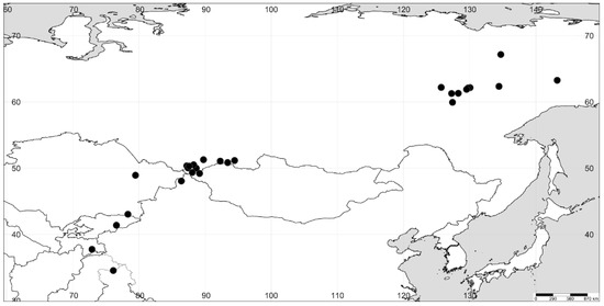 Russia: Altai Rep. (selected): Chuya, 1837, Politov 348 (LE); Ulagansky distr., Bashkaus river basin, 24 July 1940, L. Obolentsev s.n. (TK); Kosh-Agachsky distr., Sayluygem steppe, 6 August 1950, A. Kuminova and G. Pavlova s.n. (MHA); [Kosh-Agachsky distr.] nr Ukok Plateau, 25 August 1985, V. Zuev 1922 (NSK); Kosh-Agach, July 1988, V.I. Kurbatsky et al. s.n. (LE); Ulagansky distr., Aktash vill., 6 September 1990, M. Lomonosova et al. 154 (NS). Sakha-Yakutiya Rep.: [Verkhoyansky distr.] Borulahsky Nasleg, 1 July 1912, R.I. Abolin 527 (LE); Yakutsky okrug, Eren-Kyol’ landmark, 14 July 1912, R.I. Abolin 679 (LE); Yakutsk okrug, Lena river valley, Boskon Island, 17 July 1912, G.I. Dolenko 680 (LE); [Gornyi distr.] Maltaninsky Nasleg, 8 August 1912, R.I. Abolin 873 (LE); [Khangalassky distr.] Beguyrskaya station, 20 August 1912, V. Drobov 618 (LE); [Khangalassky distr.] Beguyrskaya station, 23 August 1912, V. Sokolov 1666, 1700 and 1701 (LE); between Yakutsk and Aldan, 14 August 1925, V. Drobov and A. Tarabunin 1277 (LE); Yakutsk to Viluy along Lena river, 24 September 1932, A. Bronzov s.n. (MW0058740); [Yakutsk town] Markha, 15 August 1940, M. Karavaev s.n. (TK); Tattinsky distr., 20 August 1951, V. Kuvayev 90 (MW0058741, NS); [Yakutsk town] Kandagassy, Lena River, September 1959, M. Karavaev s.n. (NSK); [Oymyakonsky distr.] Indigirka river, Tomtor vill., 6 August 1960, M. Karavayev s.n. (MW0058742); Oymyakonsky disr., Tomtor vill., 28 August 1983, A. Khokhryakov s.n. (NS); Pokrovsky Trakt, [Yakutsk town] Vladimirovka vill., 23 August 2012, M. Lomonosova and E. Nikolin 825 (NS); Khangalassky distr., nr Ulakhan-An vill., 24 August 2012, M. Lomonosova and E. Nikolin 857 (NS). Tyva Rep.: Elegest river, Bai-Khaak, 26 July 1916, G. Miklashevskaya s.n. (LE); Tes-Khemsky distr., West Tannu-Ola Range, Kholu River basin, 7 August 1972, V. Khanminchun et al. 100353 (NS); Ovyursky distr., West Tannu-Ola Range, 29 July 1975, V. Khanminchun and D. Shaulo 1086 (NS); Bai-Taiginsky distr., nr Kara-hol Lake, 1650 m, 26 July 1976, I. Krasnoborov et al. 496 (LE, NS); Mongun-Tayginsky distr., 30 July 1981, M. Lomonosova and T. Akimenko 2882 (LE, MW0058743, NS).