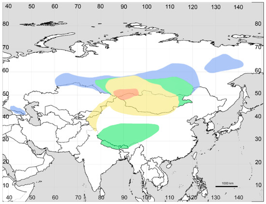 We revised the distribution of Axyris in Siberia, and in particular, we found that the range of A. sphaerosperma is drastically different from the one previously reported (Figure 1, Figure 2, Figure 3 and Figure 4). Based on our recent results and the previous study [1], the highest species diversity of Axyris is seen in Southern Siberia, Mongolia, and NW China (Figure 5), where four species are present (A. amaranthoides, A. hybrida, A. prostrata, and A. sphaerosperma), followed by the Tian Shan and Pamir Mountains (A. hybrida, A. prostrata, and A. sphaerosperma) and the Himalayas/Tibet (A. mira and A. prostrata). One native species each is present in Eastern Siberia (Sakha [Yakutiya] Republic) and in the Greater Caucasus: A. sphaerosperma and A. caucasica, respectively.