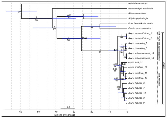 The maximum clade credibility tree of Axyris obtained by the BEAST2 analysis was subjected to secondary calibrations (see Methods). Posterior probabilities resulting from the Bayesian analysis are indicated above branches (only values ≥ 0.9), and the numbers below branches refer to bootstrap values resulting from the ML analysis (only values ≥ 70). Mean divergence times (values at some nodes) are shown with their 95% HPD (blue bars).