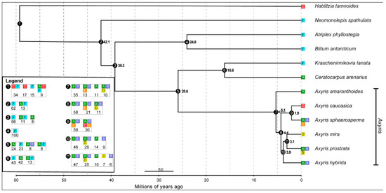 The origin of this genus is probably connected with the orographic and climatic changes in the late Miocene/early Pliocene, which are manifested in renewed tectonism and further aridification of the lowlands in South Siberia and Tian-Shan [21]. The same region of origin, for example, is reported for Krascheninnikovia ceratoides (L.) Gueldenst. [22,23], a species also belonging to Axyrideae [13]. It is still not clear whether the origin of Axyris and Krascheninnikovia is linked to high-altitude or lowland steppes, but it is thought that the late Miocene and early Pliocene are the time scales where a continent-wide restructuring of the distribution of landscape-forming elements was taking place, including a new zonal structure component: steppe formation [24]. Our time-calibrated tree coincides with previous study [25]. Divergence time between Axyris and Krascheninnikovia + Ceratocarpus group is 26.5 mya and between Krascheninnikovia and Ceratocarpus is 16.4 mya, which generally corresponds with our data (25.6 and 15.9 mya, respectively).