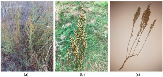 Artemisia campestris subsp. lednicensis (Spreng.) Greuter & Raab-Straube. (a) In its natural habitat, near Aroneanu Lake (Iasi county, Romania); (b) inflorescence; (c) herborized plant material (Photo by Adriana Trifan).