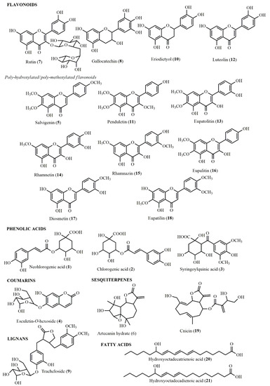 In addition, one glycosylated lignan, possibly belonging to the structure of tracheloside (9), was labeled. This lignan was also previously present in A. annua, A. austriaca, and A. vulgaris [18]. Finally, two sesquiterpenes, artecanin hydrate (6) and cnicin (19), and two fatty acids, hydroxyoctadecatrienoic acid (20) and hydroxyoctadecadienoic acid (21), were tentatively annotated. These classes of specialized metabolites were evidenced in A. annua, A. pontica, A. austriaca, A. vulgaris, or A. absinthium [18].