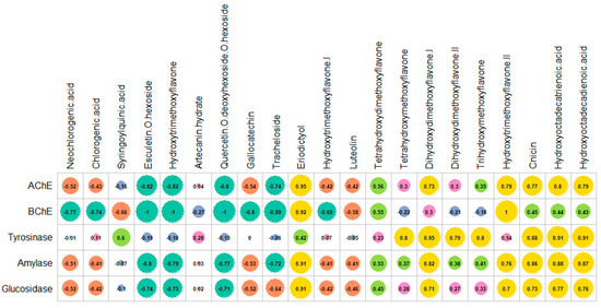 Pearson correlation between enzyme inhibitory activity and individual phytochemicals.
