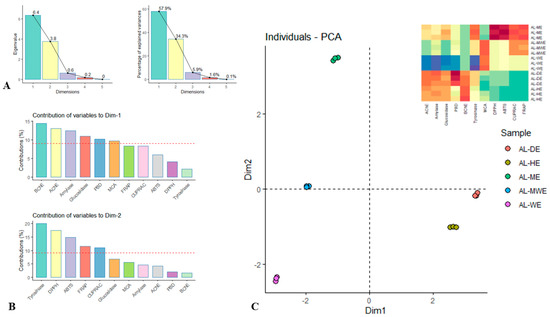 Principal component analysis on the biological activities of the A. campestris subsp. lednicensis aerial part extracts. (A) Eigenvalue and percentages of the explained variances of each dimension. (B) Contribution of variables on the dimensions of PCA. (C) Scatter plot showing the distribution of the samples in the two retained dimensions.