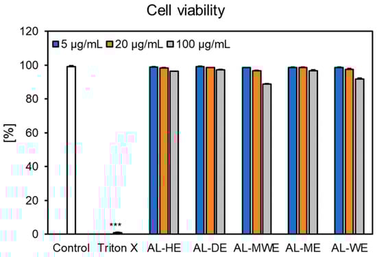 Neutrophil viability (%) after treatment with Artemisia campestris subsp. lednicensis extracts at concentrations of 5–100 μg/mL and Triton X-100 (0.1%). Results are presented as the mean ± SEM of three separate experiments performed with cells isolated from six independent donors; *** p < 0.001 vs. non-stimulated control. Legend: AL-HE, A. campestris subsp. lednicensis hexane extract; AL-DE, A. campestris subsp. lednicensis dichloromethane extract; AL-ME, A. campestris subsp. lednicensis methanol extract; AL-MWE, A. campestris subsp. lednicensis 50% methanol extract; AL-WE, A. campestris subsp. lednicensis water extract.