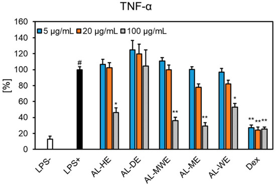 The effects of Artemisia campestris subsp. lednicensis extracts (5–100 μg/mL) and dexamethasone (Dex) (0.01–1 µM) on TNF-α release in LPS-stimulated (100 ng/mL) neutrophils. Results are presented as the mean ± SEM of three separate experiments performed with cells isolated from six independent donors; # p < 0.001 vs. non-stimulated control (LPS-); * p < 0.05; ** p < 0.001 vs. stimulated control (LPS+). Abbreviations: AL-HE, A. campestris subsp. lednicensis hexane extract; AL-DE, A. campestris subsp. lednicensis dichloromethane extract; AL-ME, A. campestris subsp. lednicensis methanol extract; AL-MWE, A. campestris subsp. lednicensis 50% methanol extract; AL-WE, A. campestris subsp. lednicensis water extract; LPS, lipopolysaccharide.
