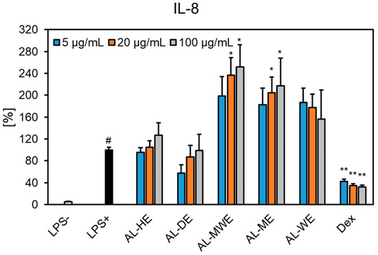 The effects of Artemisia campestris subsp. lednicensis extracts (5–100 μg/mL) and dexamethasone (Dex) (0.01–1 µM) on IL-8 production in LPS-stimulated (100 ng/mL) neutrophils. Results are presented as the mean ± SEM of three separate experiments performed with cells isolated from six independent donors; # p < 0.001 vs. non-stimulated control (LPS-); * p < 0.05; ** p < 0.001 vs. stimulated control (LPS+). Abbreviations: AL-HE, A. campestris subsp. lednicensis hexane extract; AL-DE, A. campestris subsp. lednicensis dichloromethane extract; AL-ME, A. campestris subsp. lednicensis methanol extract; AL-MWE, A. campestris subsp. lednicensis 50% methanol extract; AL-WE, A. campestris subsp. lednicensis water extract; LPS, lipopolysaccharide.