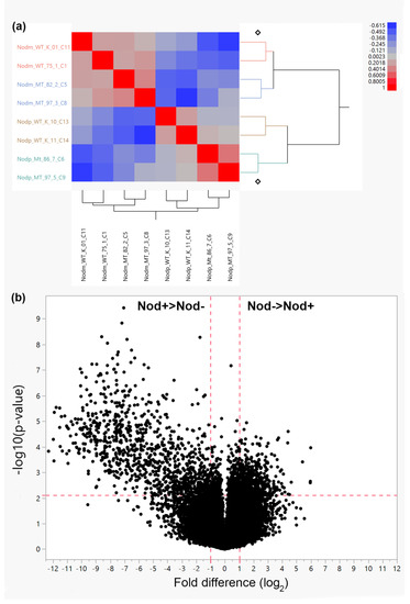 (a) Dendogram and heat map of Nod+ (labeled as Nodp for the samples displayed in the figure vertical axis) and Nod− (labeled as Nodm for the samples displayed in the vertical axis) expression profiles for each individual sample and (b) volcano plot showing differential expression between Nod+ (NodP) and Nod− (NodM) root samples.