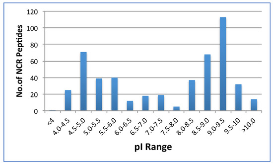 Number of the red clover NCR peptides distributed by isoelectric point (pI).