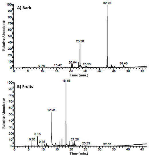 The EOs of the bark and fruits of A. nilotica were separately obtained via three hours of hydro-distillation over the Clevenger apparatus, where they yielded 0.072% and 0.056% (v/w) of the oil, respectively. The yield of the EO from bark was found to be more than the fruits, and both were more varied than those described for the Nigeria ecospecies [24]. The oils were analyzed via GC-MS (Figure 1).