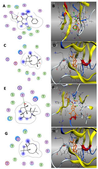 Two-dimensional binding mode of the co-crystallized ligand (A) and validation of docking study (B), 2D binding mode and 3D binding modes of caryophyllene oxide (C,D), spathulenol (E,F), and trans-caryophyllene (G,H) in the active site of 3C protease of HAV (PDB ID: 1QA7): overlay of the experimental (green) and docked conformation (orange).