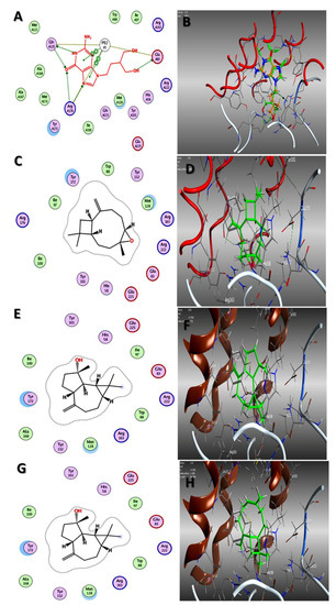 Molecular Operating Environment (MOE Vs. 2015) docking studies were performed on the catalytic domains of HAV 3C protease (PDB ID: 1QA7) [58] and HSV thymidine kinase (PDB ID: 1KI3) [58] and thymidine kinase of HSV (PDB ID: 1KI3) [59]. The crystal structures of both proteins were retrieved from the protein data bank and processed as previously described [60], as well as the database file (mdb) of the major identified compounds in both EOs, stachene, caryophyllene oxide, spathulenol, trans-caryophyllene, Z-anethole, and γ-terpinene. The docking process was validated by re-docking the co-crystallized ligands in the binding site, which revealed their binding with crucial sub-pockets (Val 28 and Cys 172 and Gln A125, Arg A176, and Glu A83) in both proteins, respectively, at acceptable RMSD (Figure 2 and Figure 3). After processing the study in triplicate (as shown in Table S1), the results of the docking process were presented as the ΔG (kcal/mol) with RMSD values ≤ 2 Å (Table 2). In addition, the interactions of the lowest energy pose with the binding pocket were two and three-dimensionally presented in (Figure 2 and Figure 3).