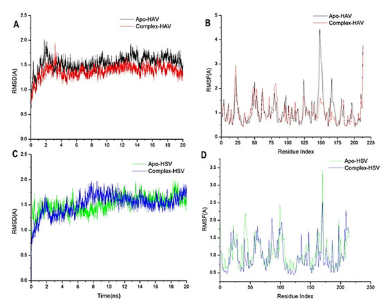 (A) RMSD of Cα atoms of the 3C protease of HAV protein backbone atoms. (B) RMSF of each residue of the 3C protease of HAV protein backbone Cα atoms (C) RMSD of Cα atoms of the thymidine kinase of HSV protein backbone atoms (D) RMSF of each residue of the thymidine kinase of HSV protein backbone Cα atoms.