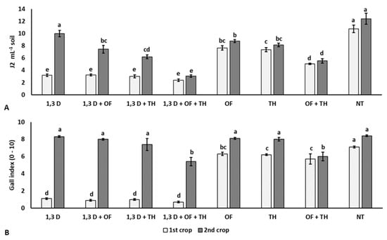 Figure 1. Effects of soil treatments with 1,3-dichloropropene (1,3-D), Trichoderma harzianum (TH) and an organic fertilizer (OF), either alone or in combination, on final population density (A) and root gall infestation (B) of Meloidogyne incognita in two consecutive tomato crops. NT = non-treated control. Bars show the average of n = 4 replicates of each treatment ± standard error. Within each tomato crop, bars marked by the same letters are not significantly different, according to the least significant difference test (p ≤ 0.05).