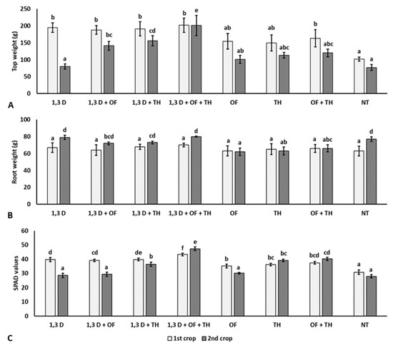 Figure 3. Effects of soil treatments with 1,3-dichloropropene (1,3-D), Trichoderma harzianum (TH) and an organic fertilizer (OF), either alone or in combination, on weight of aerial parts (A), roots (B) and chlorophyll content (C) of plants from the two tomato crops. NT = non-treated control. Bars show the average of n = 4 replicates of each treatment ± S.E. Within each tomato crop, bars marked by the same letters are not significantly different according to the least significant difference test (p ≤ 0.05).