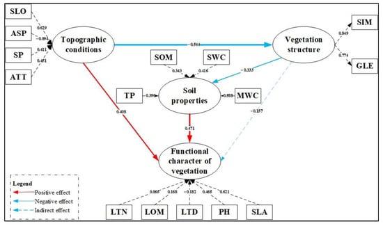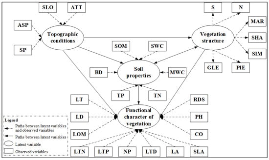 The SEM analysis method is a comprehensive technique that uses covariance matrix to analyze the relationships in multivariate data and identify the causality between observed variables and latent variables. In this study, we explained the relationships between the various influencing factors that pertain to plant functional traits by using latent variables and observational variables. The PLS-SEM was constructed by selecting three explanatory latent variables (topographic conditions, soil properties and vegetation structure) and one latent dependent variable (plant functional traits). Six explanatory observation variables were used to represent the latent variable characteristics of soil, namely soil organic matter content (SOM), soil water content (SWC), soil bulk density (BD), maximum soil water content (MWC), soil total phosphorus content (TP) and soil total nitrogen content (TN). Four topographic variables, namely altitude, slope, slope position and aspect, were chosen due to their effect on the hydrothermal conditions of sampling sites. In order to ensure the integrity of the vegetation diversity information, research needs of the integration of multiple levels and multiple diversity indexes []. We selected five different vegetation diversity indexes and two features as latent variables to illustrate vegetation structure, including the total number of plants (N), plants species index (S), Shannon–Wiener index (SHA), Simpson index (SIM), Margalef index (MAR) and Gleason index (GLE). Finally, 12 indexes, including leaf thickness, leaf dry weight, organic matter of leaves, total nitrogen content, total phosphorus content, nitrogen-to-phosphorus ratio, leaf tissue density, leaf area, specific leaf area, vegetation coverage, average plant height and ratio of dominant species were used to represent the observed variables of plant functional traits (Tables S2 and S3).
