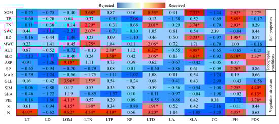 Based on the results of model, in addition to topographic conditions, soil properties also directly affect the plant functional traits []. Some scholars also reported similar results, pointing out the availability of underground nutrients plays a key role in plant growth [].